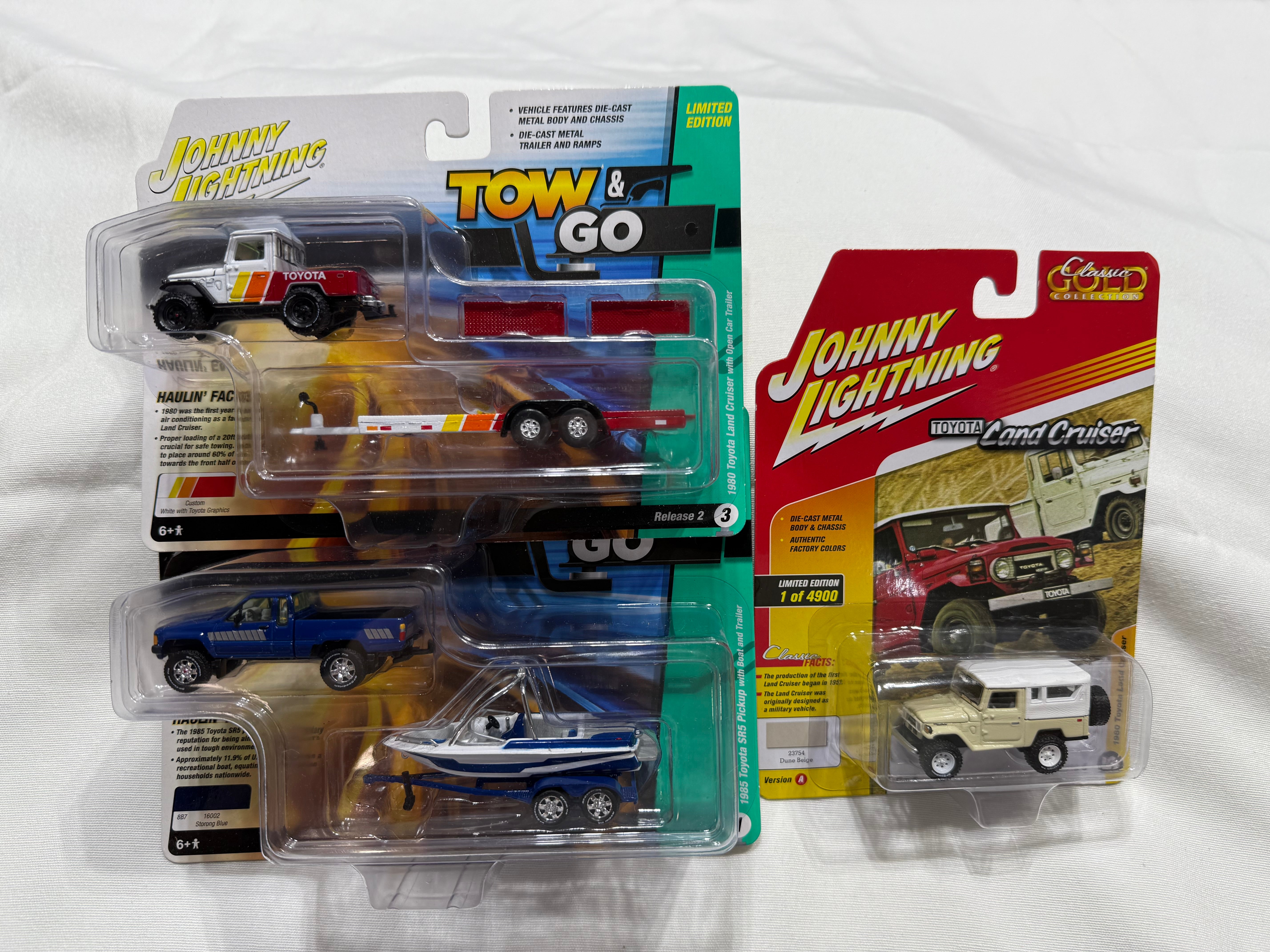 A lot containing 1:64 scale Johnny Lightning brand Toyota pick-up and Land Cruiser pieces.